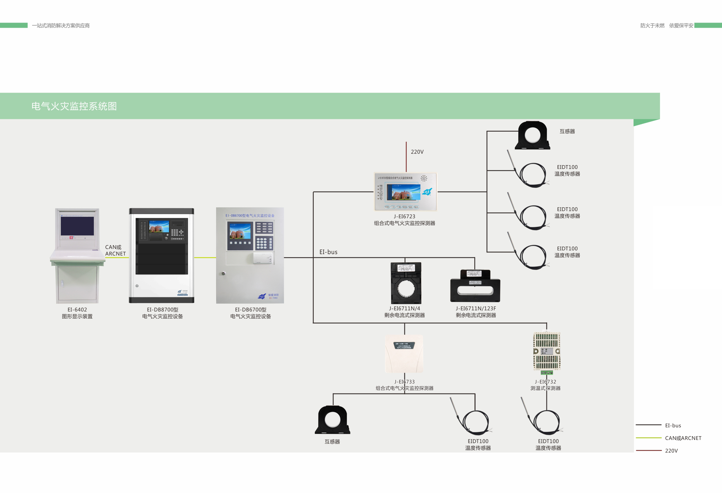 EI 系列電氣火災(zāi)監(jiān)控系統(tǒng)應(yīng)包括電氣火災(zāi)監(jiān)控設(shè)備、剩余電流探測器(電流互感器)、測溫式探測器(傳感器)等產(chǎn)品。