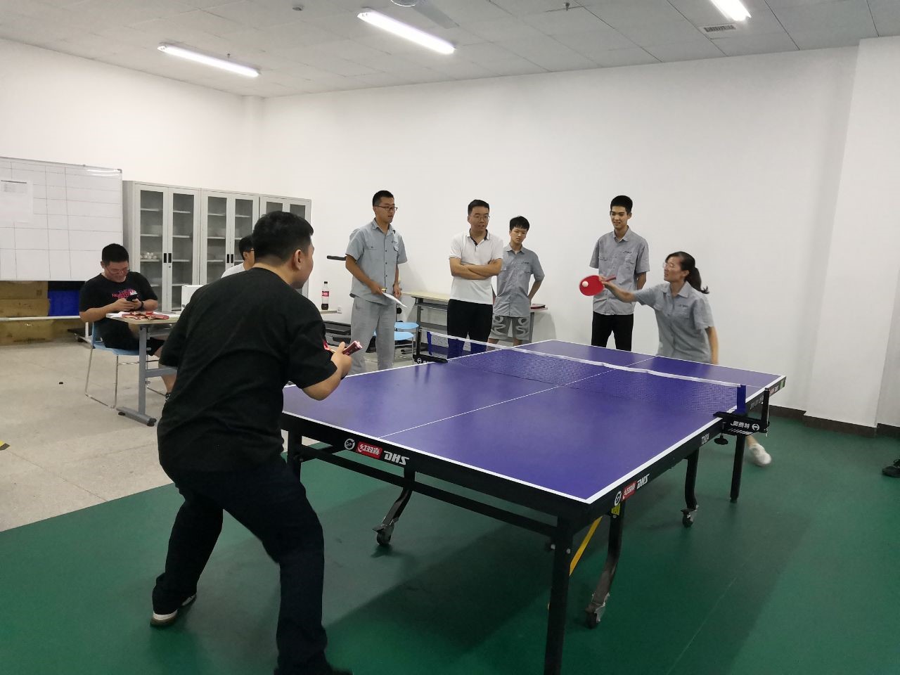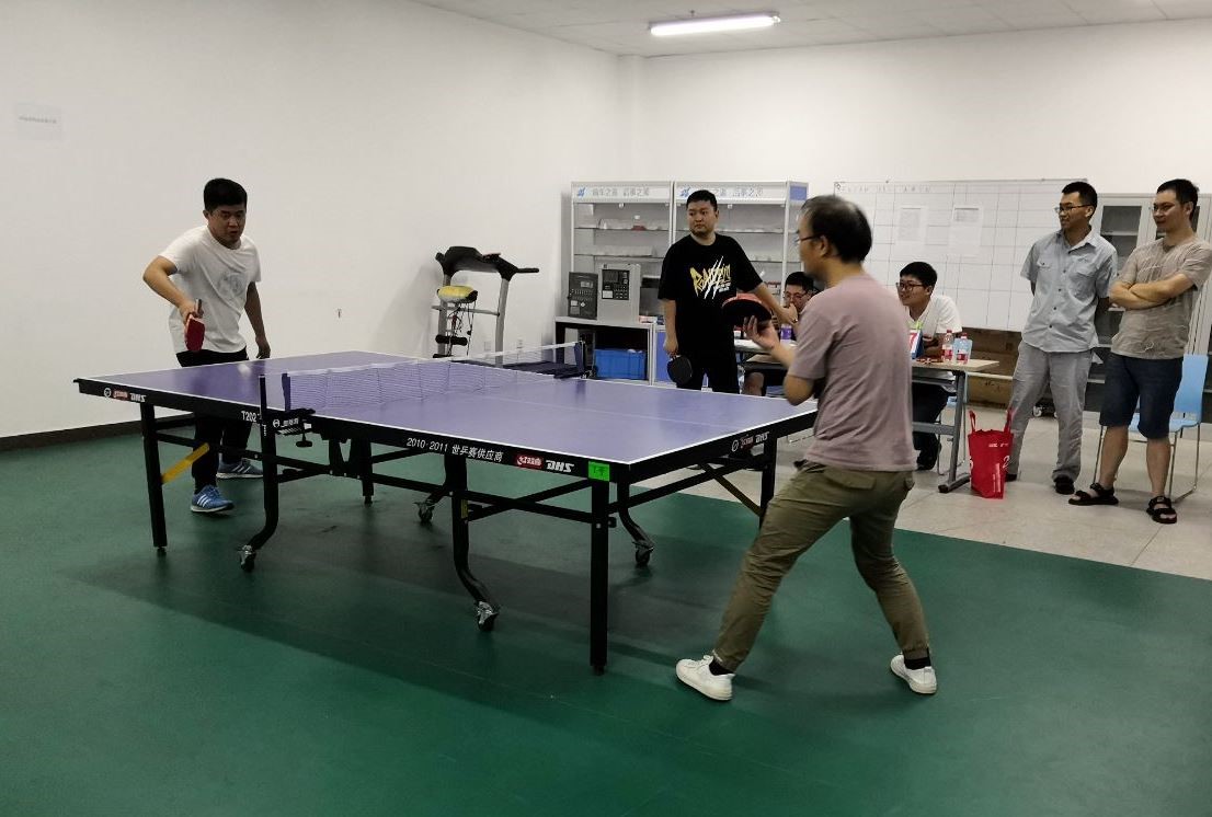 下午進(jìn)行的團(tuán)體比賽,現(xiàn)場(chǎng)氣氛進(jìn)入了高潮。本次比賽規(guī)則規(guī)定,男女對(duì)打時(shí),在每一局開始時(shí),女選手以8:0開始,雙打有女選手的一方以6:0開始,與女選手比賽時(shí),男選手壓力非常大,每一局都緊張刺激,現(xiàn)場(chǎng)觀眾給雙方加油聲不斷。最終,按照決賽積分排名,研發(fā)一隊(duì)(翟耀、王建軍、桓宗圣)獲得第一名,研發(fā)二隊(duì)(方宜海、王立龍、龐傳道)獲得第二名。