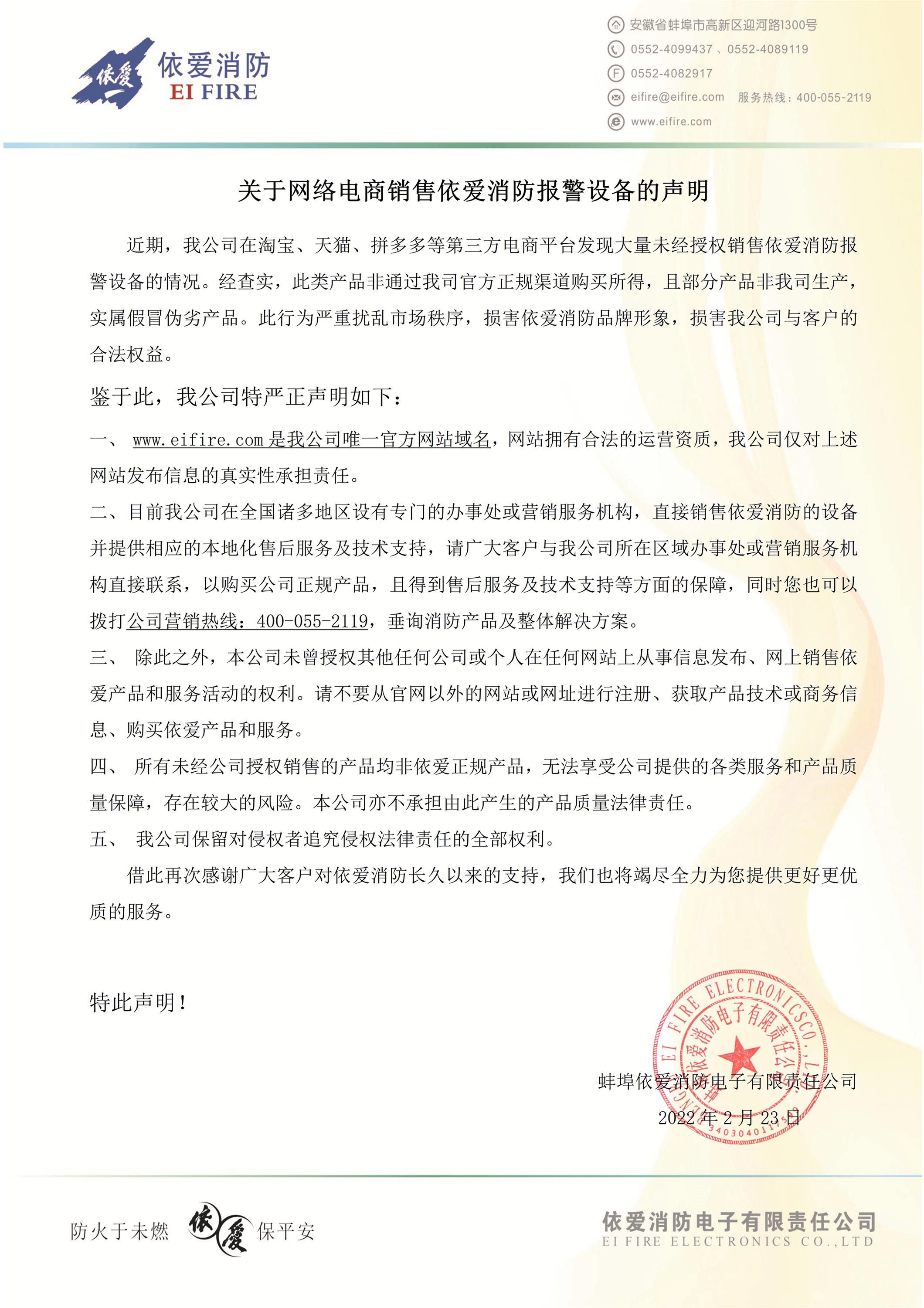 重要通知!關(guān)于網(wǎng)絡(luò)電商銷(xiāo)售依愛(ài)消防報(bào)警設(shè)備的聲明