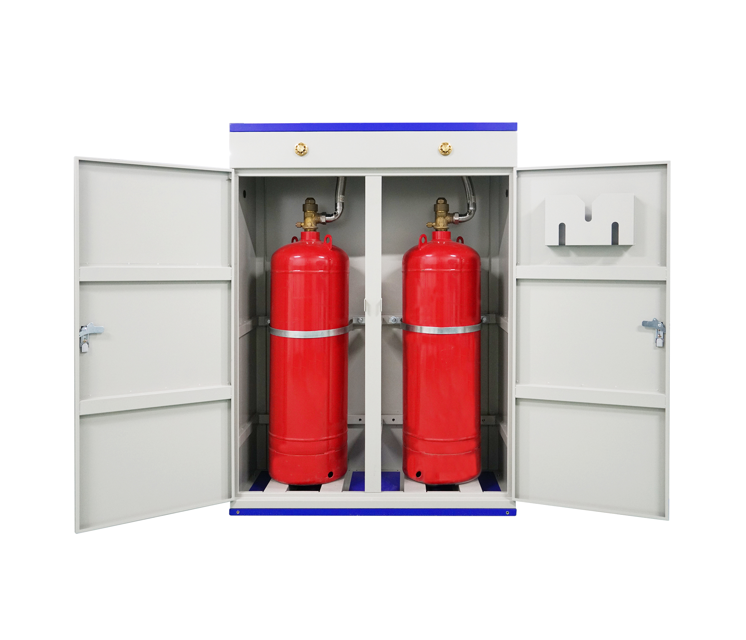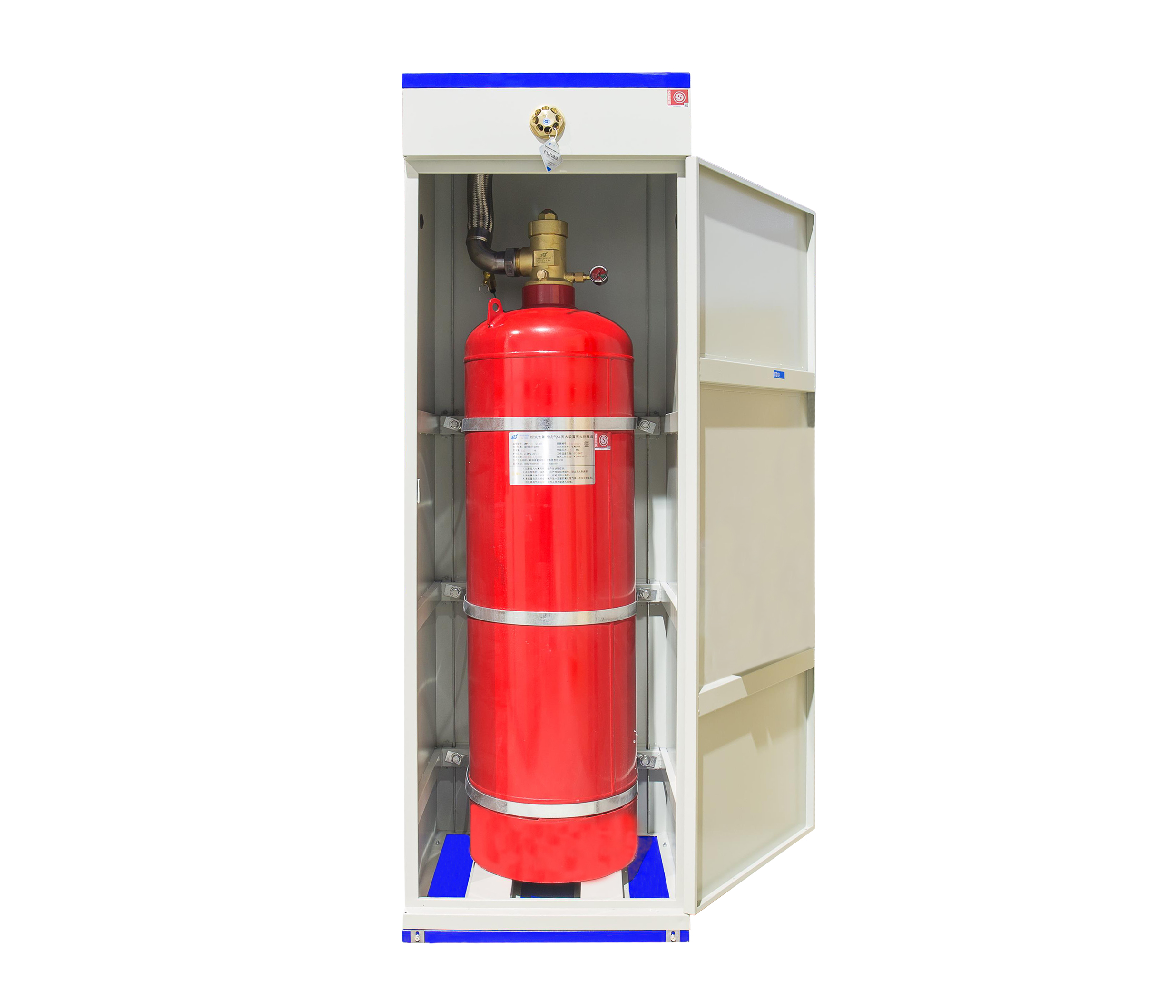 柜式七氟丙烷氣體滅火裝置由柜體、噴嘴、連接管、容器瓶、容器閥、電磁驅(qū)動(dòng)裝置、信號(hào)反饋裝置、安全泄放裝置、壓力表、瓶箍等組成。